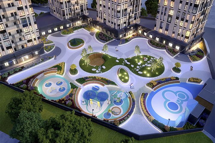 Дети смогут безопасно перемещаться по территории, где разместятся площадки с «мягким» покрытием. Весь внутренний двор отведен под ландшафтный дизайн: газоны, клумбы, цветники, малые архитектурные формы. Здесь приятно будет прогуляться и днем, и вечером, при свете декоративных фонарей.