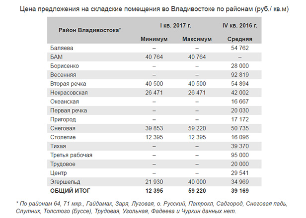 При этом рынок складской недвижимости не сжался так сильно, как рынок офисной, хотя тоже подвергся негативному влиянию новых экономических условий. Очень многие грузовладельцы закрывали склады, другая их часть была вынуждена значительно сократить количество складских остатков. Другие уменьшили количество операций или пытались снизить стоимость складской переработки. Но за счет превышения спроса над предложением рынок в целом не сильно менялся по цене в меньшую сторону, что позволило ставкам аренды быть стабильными и даже в некоторых случаях увеличиваться: по данным консалтинговой компании «Индустрия-Р», ставка аренды на складские помещения во Владивостоке в первом квартале 2017 г. составила 313 руб. за 1 м2 в месяц и увеличилась на 1,68% в сравнении с предыдущим кварталом (четвертый квартал 2016 г. — 307 руб./кв.м/мес.).