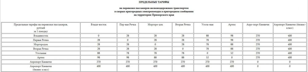 Пригородная поездка на обычных поездах обойдется теперь в среднем на 1 руб. дешевле, на электричках тарифы уменьшатся на такую же величину. Но особняком стоят рейсы из Владивостока и других населенных пунктов в аэропорт Кневичи, которые теперь обойдутся не в 250 руб., а в 270 руб. (бизнес-классом — не 380, а 400 руб.).