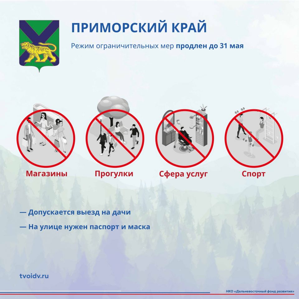 В Приморском крае, являющемся столицей Дальневосточного федерального округа, по последним данным, обнаружено уже более 1057 зараженных коронавирусом, 307 людей выздоровели, а 12 – скончались. Каждые сутки сообщается о десятках новых случаев, так что соблюдение режима повышенной готовности тщательно контролируется. При выходе из дома нужно надевать маску и брать паспорт. Гулять далеко от дома не допускается, но можно выезжать на дачу. Ограничительные меры продлены до 31 мая включительно.