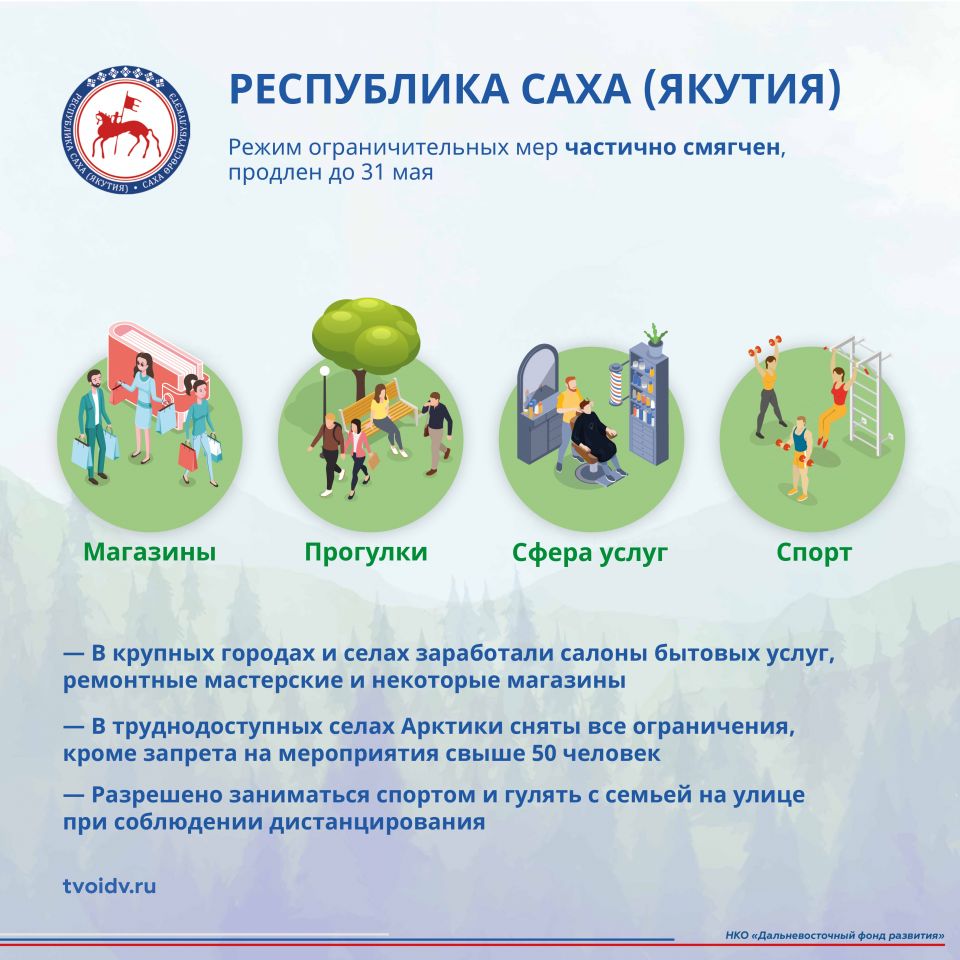 В Якутии число зараженных все еще меньше 1000 – всего 687 пациентов, 211 человек выписаны, а 4 скончались, по данным на 14 мая. Режим самоизоляции также не планируют снимать ранее 31 мая, но местами в селах убраны почти все ограничения, запрещены только мероприятия, где присутствуют более 50 человек. В регионе уже разрешены прогулки, но все еще нужно соблюдать дистанцию, также открылись некоторые магазины.