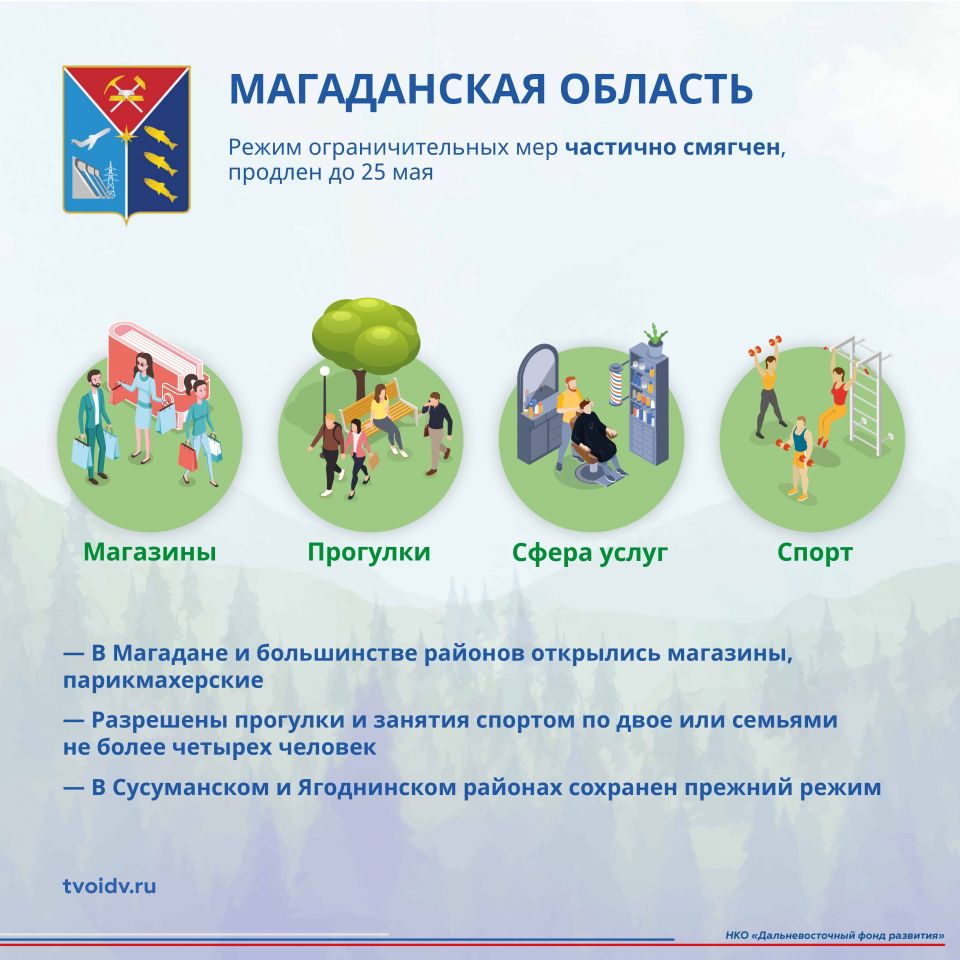 В Магаданской области число заболевших достигло 167 человек, 97 выздоровели, а 3 – скончались. Режим самоизоляции здесь планируют снять 25 мая, при соблюдении дистанции разрешены прогулки и занятия спортом. В некоторых районах региона ограничительные меры еще сохраняются, но на большей территории они смягчены. Заведения общественного питания и предприятия, работающие в сфере досуга, все еще остаются закрытыми.