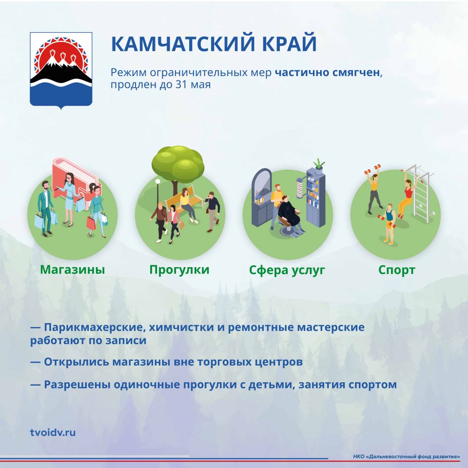В Камчатском крае 429 заболевших, 69 пациентов болезнь победили и только один человек скончался. Ограничительные меры частично смягчены, но совсем отменять их пока не торопятся. У жителей края есть возможность записаться в парикмахерскую, отправиться на прогулку с детьми и позаниматься спортом. Торговые точки, которые не расположены в торговых центрах, уже работают.
