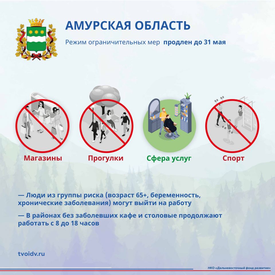 В Амурской области установлено 194 случая заражения за все время, излечился 41 человек, одного спасти не удалось. Ограничительные меры сохраняются, но местные жители могут посещать заведения общественного питания в тех районах, где зараженных коронавирусом не обнаружено. Магазины в регионе все еще закрыты, а прогулки запрещены.