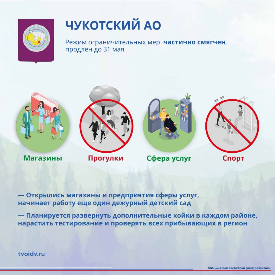 В Чукотском автономном округе самые низкие показатели по стране, заразились 36 человек, 15 из которых успешно прошли лечение, ни один пациент с коронавирусом не умер. И все же в регионе решили продлить режим самоизоляции до 31 мая, хотя уже работают магазины и предприятия в сфере услуг, а каждого прибывшего в Чукотский автономный округ будут тестировать на наличие инфекции.