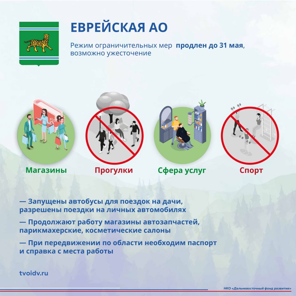 В Еврейской автономной области выявлено 218 зараженных, 49 человек выписаны, а одного спасти не удалось. Отменять режим самоизоляции здесь не планируют, могут даже ужесточить. В этом регионе, как и в Приморье, можно выезжать на дачные участки, но при перемещении в пределах области нужно брать с собой паспорт и справку с места работы. Косметические салоны и магазины работают.
