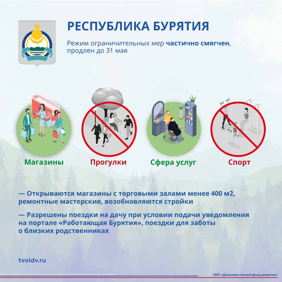 В Бурятии количество зараженных приближается к 1000, всего за время эпидемии наличие коронавируса подтвердилось у 736 человек, 256 выздоровели, а 5 – скончались. Как и в большинстве регионов, режим самоизоляции здесь продлен до 31 мая, но ограничения смягчены. Стройки уже возобновляют свою работу, вновь открываются некоторые магазины с небольшой площадью, разрешены поездки на дачи.