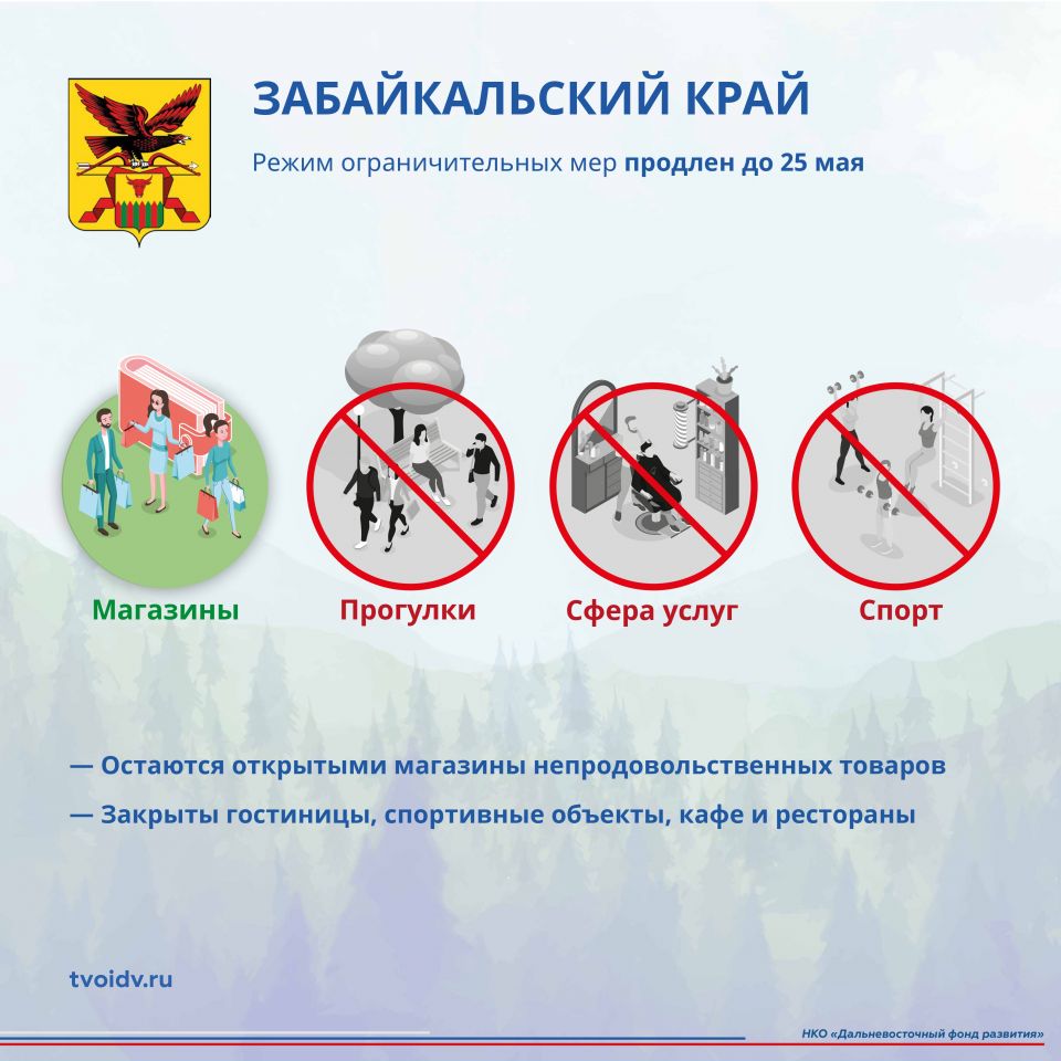 В Забайкальском крае тест на наличие коронавируса подтвердился у 432 человек, 157 выписаны, один человек справиться с инфекцией не смог. Ограничительные меры здесь не торопятся смягчать, но отменить их планируют раньше, чем во многих других регионах, – 25 мая. А до этого времени все еще закрыты заведения общественного питания, гостиницы, запрещены прогулки.