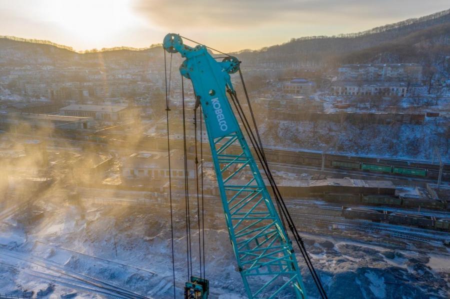 Уникальный для Дальнего Востока подъемный кран начал работу на строительстве навеса в порту «Терминал Астафьева». Его максимальная грузоподъемность составляет 250 тонн, высота подъема груза – 77 метров.