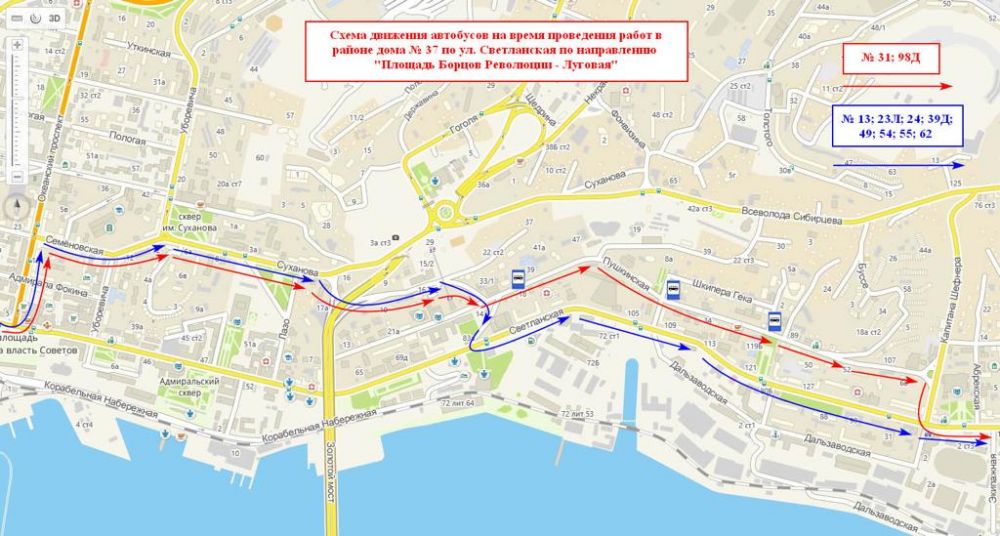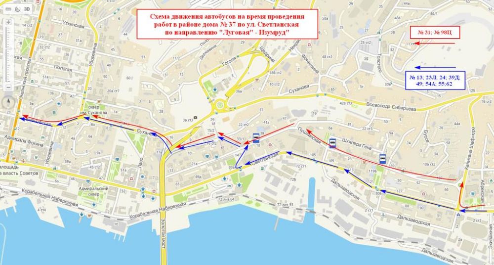 С 30 июля по 15 августа перекресток автодороги на ул. Светланской во Владивостоке (что напротив «Владивостокского ГУМа») перекроют. Автотранспорт, в том числе общественный, пустят по Пушкинской, Океанскому проспекту, Суханова, Корабельной Набережной.
