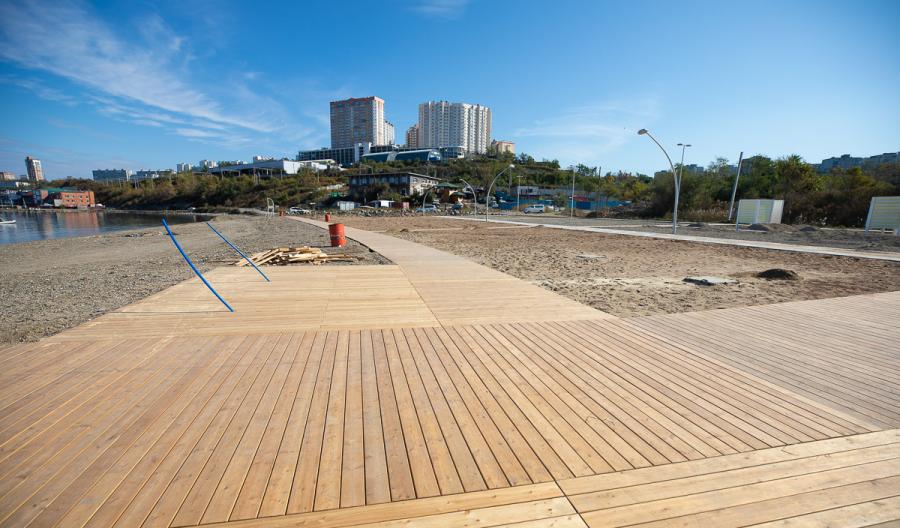 Параллельно ведется монтаж пергол (навесов) и многофункционального павильона, в котором разместится общественный туалет. Также строители приступили к обустройству детской площадки. Все оборудование было доставлено во Владивосток из Чехии.