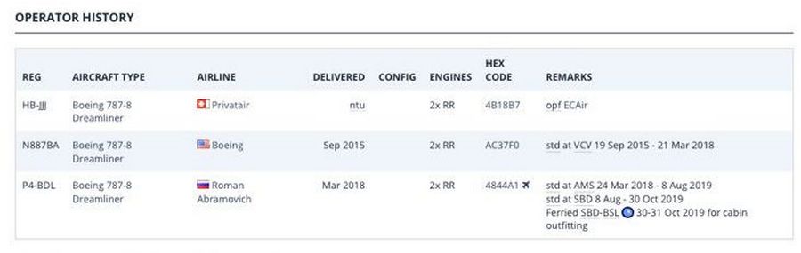 Сейчас это воздушное судно числится за Global Jet Luxembourg из группы компаний, которая управляла полетами Boeing 767-300ER Абрамовича. По данным Forbes, Boeing 767-300ER обошелся Абрамовичу в $315 млн, а вот продают его за $100 млн. Впрочем, сам олигарх уже давно летает на Boeing 787 Dreamliner (см. фото ниже). Из числа приморских «олигархов» частным самолетом чаще других пользуется бывший губернатор Сергей Дарькин с супругой.