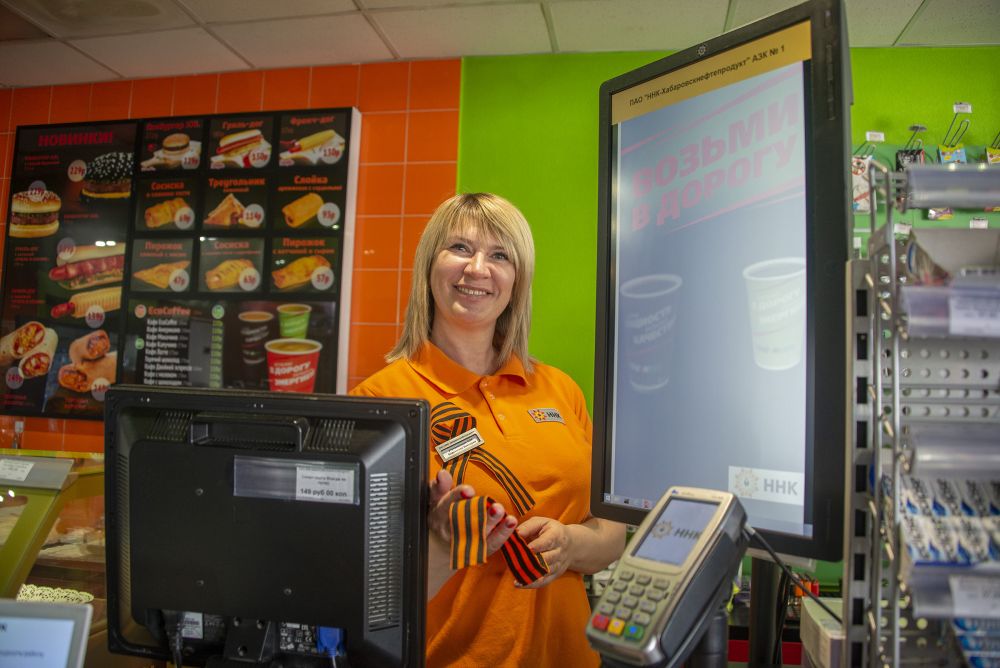 И на автозаправочных станциях сети ННК, расположенных на Дальнем Востоке, по традиции в праздничные майские дни прошла акция ко Дню Победы. Каждый клиент при заправке получил в подарок георгиевскую ленту, символизирующую память о бессмертном подвиге советского солдата.