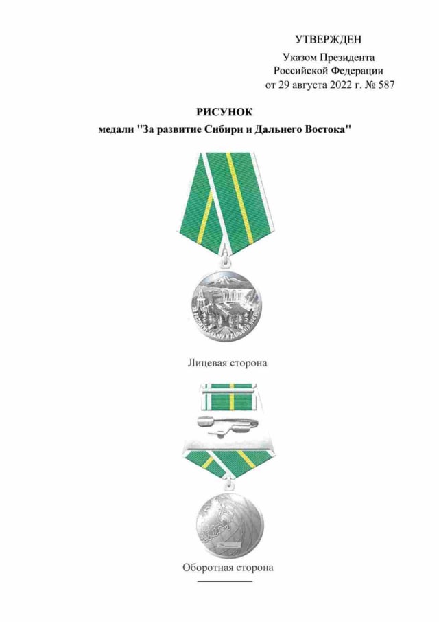 Президент Владимир Путин учредил в России новую госнаграду – медаль «За развитие Сибири и Дальнего Востока», а также юбилейную медаль «50 лет Байкало-Амурской магистрали».