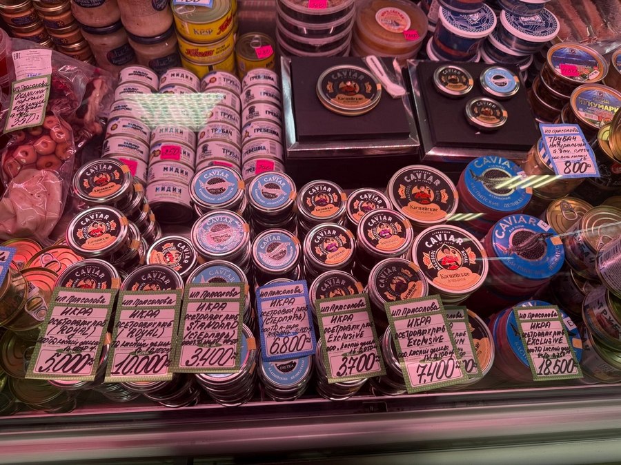 Прилавок, например, на Первореченском рынке во Владивостоке заставлен разномастными баночками под брендом «Каспийские деликатесы» (г. Астрахань). Это дойная икра разных сортов по разным ценам. Так, цена килограмма нетто икры стерляди на «первореченском» сегодня составляет 68 000 руб., а намного более вкусной осетровой — 100 000 руб.
