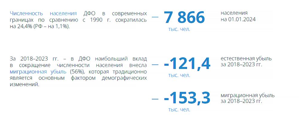 В ДФО приток населения минимален и носит временный характер. Как отметил министр по развитию Дальнего Востока и Арктики Алексей Чекунков, прирост населения в 2024 г. (14 тыс. человек) связан в основном с «вахтовиками». Основная масса бежит отсюда.