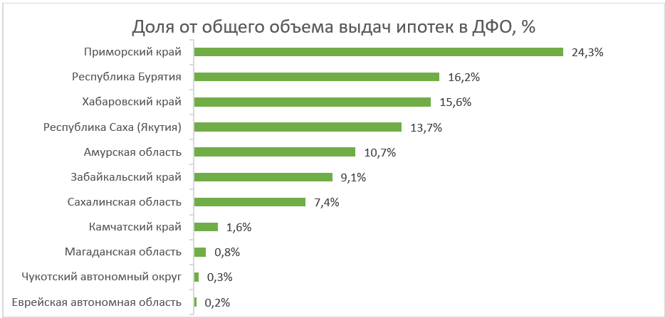 Лидером Дальневосточного округа по объему ипотечных средств на приобретение жилья в 2025 году является Приморский край, на который приходится почти четверть от выдаваемых кредитов (24,3%). Далее следуют Бурятия и Хабаровский край: 16,2 и 15,6% соответственно. Меньше всего заемных средств на покупку жилья приходится на Магаданскую область (0,8%), Чукотский автономный округ (0,3%) и Еврейскую автономную область (0,2%).