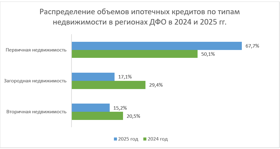 Доступность льготных программ ипотечного кредитования на Дальнем Востоке стала драйвером рынка первичной недвижимости. За первую половину 2025 года объем жилищных кредитов на покупку новостроек достиг 67,7%, прибавив 16,7 п. п. по сравнению с 2024 годом. В то же время снижаются объемы выдач ипотек на покупку загородной недвижимости (-12,3 п. п.) и вторичного жилья (-5,3 п. п.).