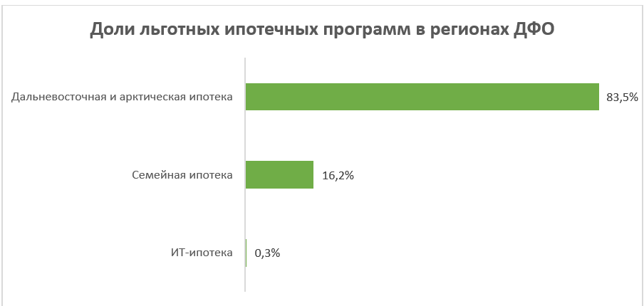 Среди них самой популярной ожидаемо является «Дальневосточная и арктическая ипотека» (ДВиА) с долей в объеме выдач в 83,5%. На семейную ипотеку приходится 16,2% льготных жилищных кредитов, а на ИТ-ипотеку только 0,3%.