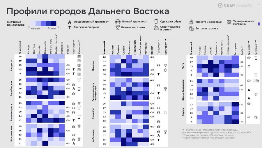 Дарья Цыплакова, управляющий директор, руководитель лаборатории СберИндекс: «В большинстве городов Дальнего Востока мы выявили консервативный экономический тип жителей с невысокими расходами, которые ориентированы на локальное потребление. Они совершают покупки в одних и тех же магазинах, большая часть их расходов – обязательные траты на продовольствие, услуги ЖКХ и лекарства. В эту категорию входит 34% населения Анадыря, 17% жителей Хабаровска, 14% Благовещенска, 15% Якутска, 12% Улан-Удэ, 11% Владивостока и Южно-Сахалинска. Низкая мобильность повышает привлекательность онлайн-каналов, однако низкая покупательная способность сдерживает покупателей в офлайне».