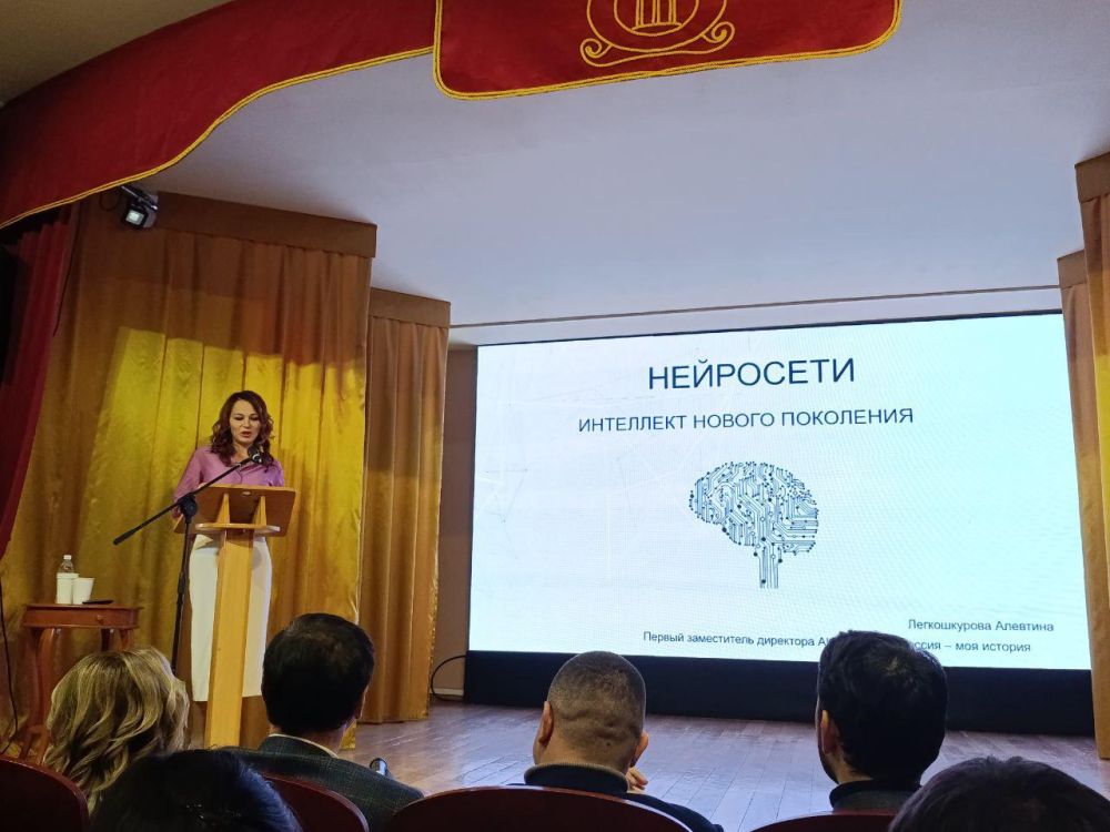 Первый заместитель директора Приморского культурно-исторического центра Алевтина Легкошкурова затронула актуальную тему «Использование нейросетей в современной культуре». Она рассказала о применении нейронных сетей для создания видеороликов, звукового сопровождения и иллюстраций к мероприятиям, проводимым ведомством. В качестве примера был приведен видеоролик, посвященный последнему этапу Великой Отечественной войны – маю 1945 г., сгенерированный с помощью искусственного интеллекта.