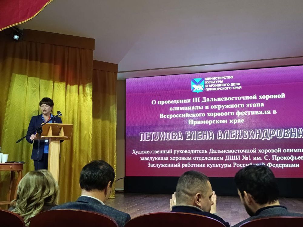 «В рамках III Дальневосточной хоровой олимпиады также прошел окружной этап Всероссийского хорового фестиваля. В нем принял участие 21 хор из 7 субъектов Дальневосточного федерального округа. Стоит отметить, что одним из обязательных условий для участия было исполнение патриотической песни. В финальный этап фестиваля прошли пять коллективов, три из которых – из Приморья», – поделилась Елена Петухова.
