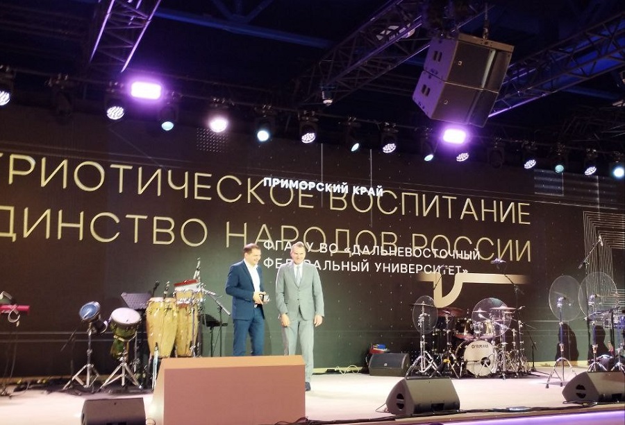 Дальневосточный федеральный университет (ДВФУ) одержал победу во Всероссийском конкурсе команд вузов по молодежной политике и воспитательной деятельности. На торжественной церемонии в Национальном центре «Россия» в Москве ДВФУ был удостоен звания лучшего в номинации «Патриотическое воспитание и единство народов России».