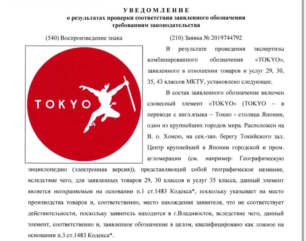 В распоряжении редакции KONKURENT.RU имеется уведомление о результатах проверки заявки на регистрацию товарного знака. В документе четко указано: «В результате проведения экспертизы комбинированного обозначения TOKYO... установлено следующее: в состав заявленного обозначения включен словесный элемент TOKYO (в переводе с английского языка – Токио – столица Японии)... представляющий собой географическое название, вследствие чего для заявленных товаров 29, 30 классов и услуг 35 класса данный элемент является неохраняемым... поскольку указывает на место производства товаров и, соответственно, местонахождения заявителя, что не соответствует действительности, поскольку заявитель находится в г. Владивосток, вследствие чего данный элемент, соответственно, и заявленное обозначение в целом квалифицировано как ложное».