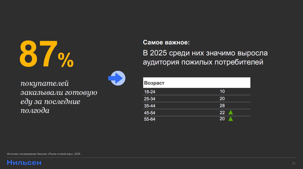 Пенсионеры также постепенно проявляют интерес к готовой еде, хотя пока это не массовое явление. Пожилые люди берут готовую еду, чтобы попробовать или вдохновиться на самостоятельное приготовление дома. Более серьезные блюда в супермаркетах, такие как салаты и комплексные наборы, пользуются популярностью благодаря выгодным комбо-предложениям. Ключевое слово – «выгодным».