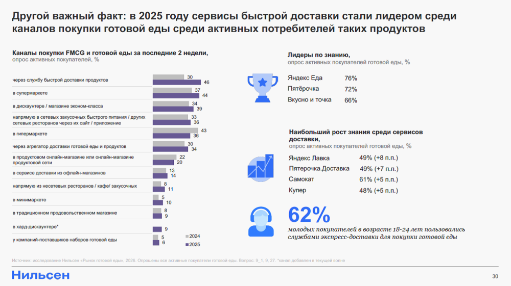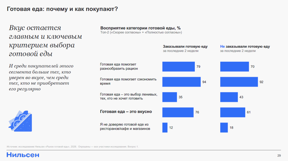 Статистика говорит сама за себя: согласно исследованию НАФИ, 76% россиян хотя бы раз пробовали готовую еду из магазина, а каждый пятый покупает ее еженедельно. Прогнозы на 2026 г. предвещают увеличение оборота продаж готовых блюд и выпечки в России почти на 44%. Особенно впечатляющие темпы роста ожидаются на Дальнем Востоке, где к 2030 г. рынок может вырасти в пять раз по сравнению с 2024 г., достигнув 289 млрд руб. И главными бенефициарами этого роста становятся торговые сети, где покупательская активность в сегменте готовой еды уже превышает 32%.
