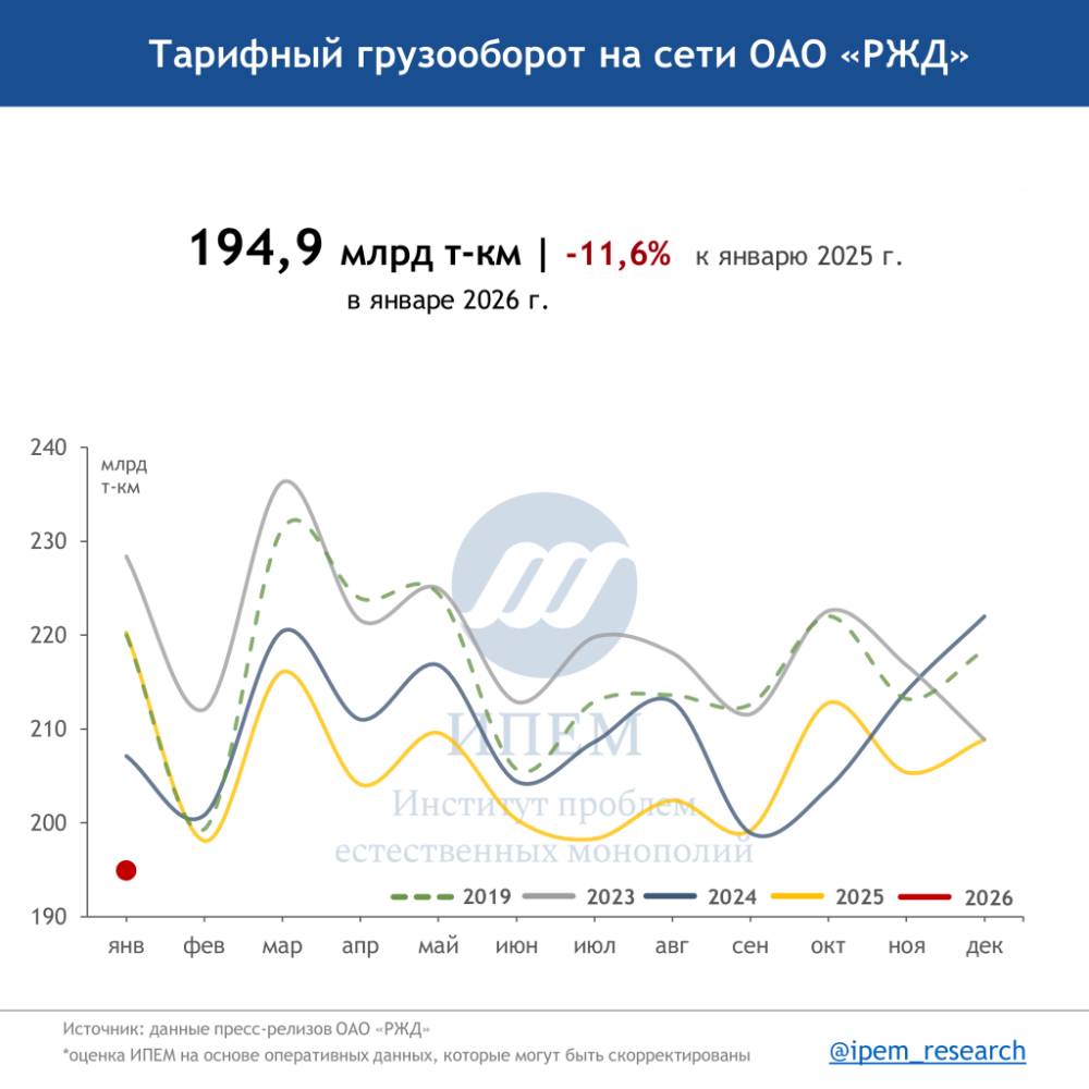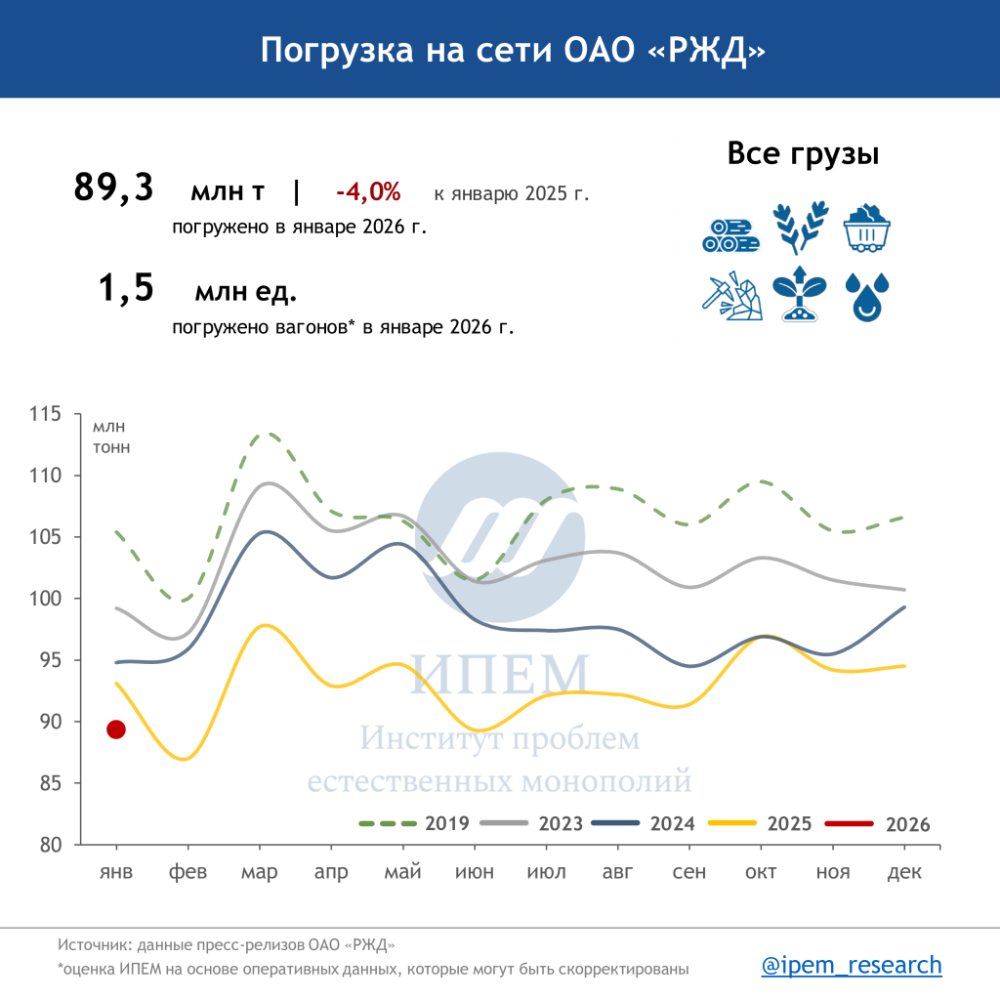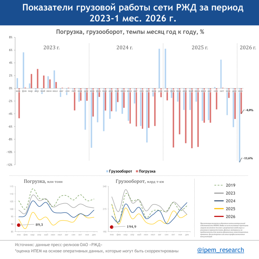 Кризисная ситуация в РЖД усугубляется. По итогам января 2026 г. погрузка на сети РЖД упала на 4% к аналогичному периоду 2025 г. Эксперты сходятся во мнении, что для оздоровления ситуации необходимы глубокие структурные изменения.