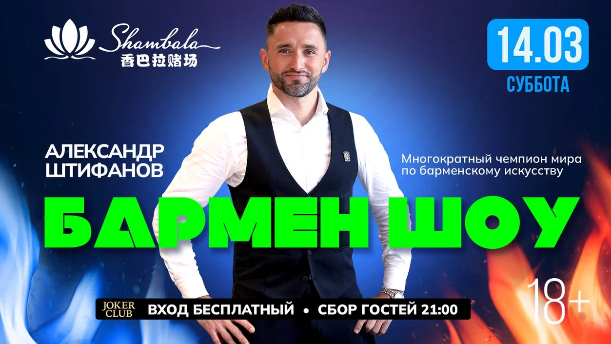 Эксклюзивное выступление многократного чемпиона мира по барменскому искусству: 1-е место в России, 2-е в Европе, 5-е в мире. Александр Штифанов превратит приготовление коктейлей в захватывающее шоу, где бутылки и шейкеры оживают в руках мастера.