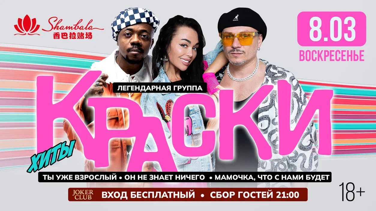 Хедлайнер вечера – легендарная поп-группа, чьи песни стали саундтреком юности для миллионов. «Оранжевое солнце», «Старший брат», «Я полюбила бандита», «Сегодня к маме я приехала домой» – эти хиты звучали на каждой школьной дискотеке начала 2000-х. В Международный женский день «Краски» подарят гостям «Шамбалы» вечер теплой ностальгии и беззаботного настроения.