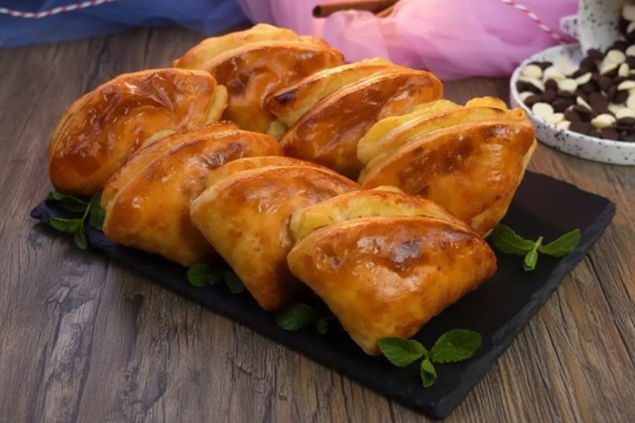 Затем по радиусу теста следует сделать надрез, после чего свернуть слойку в «кармашек». Сверху заготовки смазываются взбитыми яйцами и отправляются в духовку на 10-15 минут.