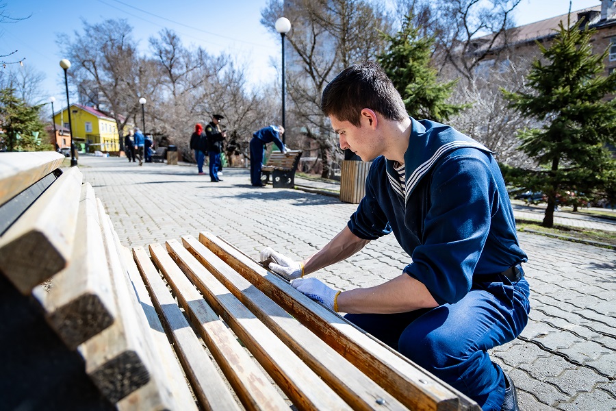 В Сквере юнг на Бестужева собрались около 80 человек. Помимо сотрудников Транспортной группы, на субботник вышли курсанты МГУ Невельского и школьники – учащиеся Морских классов FESCO. Сквер привели в порядок после зимы: убрали старые листья и траву, подмели дорожки, покрасили бордюры, обработали деревья от паразитов и залакировали лавочки.