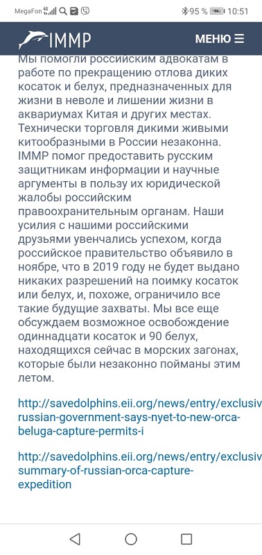 Зато на сайтах международных организаций, которые добиваются закрытия окенариумов, ситуации в бухте Средней уделяется повышенное внимание. На своем сайте международные лоббисты разместили следующую информацию: «Помогли российским адвокатам в работе по прекращению отлова диких косаток и белух, предназначенных для содержания в неволе. IMMP помог составить русским защитникам юридические жалобы в российские правоохранительные органы. Наши усилия с нашими российскими друзьями увенчались успехом, когда российское правительство объявило в ноябре, что в 2019 г. не будет выдано никаких разрешений на поимку косаток или белух, и, похоже, ограничило все такие будущие отловы. Обсуждаем освобождение одиннадцати косаток и 90 белух, находящихся сейчас в морских вольерах, которые были незаконно пойманы этим летом».